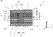 多層基板11は、図9に示すように、一方の側に第一導体層21、及び一方の側とは反対側の他方の側に第二導体層22を有した第一の誘電体層41と、一方の側に第三導体層23、及び一方の側とは反対側の他方の側に第四導体層24を有し、第二導体層22と間隔を空けて第三導体層23が配置された第二の誘電体層42と、第二導体層22と第三導体層23との間に配置された単数又は複数の中間誘電体層43と、第二導体層22から第三導体層23の方向に中間誘電体層43を貫通し、中間誘電体層43の特定の部分を取り囲む複数のビアホール71とを備える。中間誘電体層43は、単数でも複数でも構わない。本実施の形態では、多層基板11は、5つの中間誘電体層43として、中間誘電体層43a、43b、43c、43d、43eを有する。多層基板11が複数の中間誘電体層43を有した場合、少なくとも、複数のビアホール71からなる導波管33及び特定の部分を除いた複数の中間誘電体層43のそれぞれの間の部分には、中間導体層25が設けられる。本実施の形態では、多層基板11が5つの中間誘電体層43を有するため、4つの中間導体層25a、25b、25c、25dが設けられる。多層基板11が有した導体層のそれぞれは、例えば、銅箔である。As shown in Fig. 9, the
