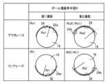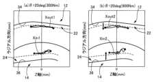 図9(a)に示す、ボール16と外側ボール溝22との接触点の軌跡Xout1を、図9(b)に示す、ボール16と外側ボール溝22との接触点の軌跡Xout2と比べると、軌跡Xout2の方が、軌跡Xout1に比べて外側ボール溝22の溝底34から離れた位置で推移している。また、図9(a)に示す、ボール16と内側ボール溝24との接触点の軌跡Xin1を、図9(b)に示す、ボール16と内側ボール溝24との接触点の軌跡Xin2と比べると、軌跡Xin2の方が軌跡Xin1に比べて内側ボール溝24の溝底36から離れた位置で推移している。When comparing the trajectory Xout1 of the contact point between the