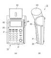 図2は、カード決済端末10の外観構成を示すものである。カード決済端末10は、その上面でなる操作面20にテンキーを含む複数の操作キー21と、液晶パネルからなるディスプレイ22とが配設されている。また操作面20の上端部にはレシート用のロール紙を収納するためのロール紙収納部23が設けられ、操作面20の右側には磁気カードや、接触又は非接触のICカードのすべてに対応したカードリーダ部24が設けられている。 FIG. 2 shows an external configuration of the