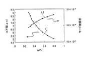 また、図7の線L2に示されるように、コア部の比屈折率差とコア径との関係を式(3)で表されるようなものにした場合に、比屈折率差を0.32%以上にすれば、モード複屈折を、実用上十分な値と考えられる1.0×10−4以上にすることができるので好ましく、比屈折率差を0.47%以上にすれば、モード複屈折を2.0×10−4以上にすることができるのでさらに好ましい。Further, as shown by a line L2 in FIG. 7, when the relationship between the relative refractive index difference of the core portion and the core diameter is expressed by the equation (3), the relative refractive index difference is set to 0. If it is 32% or more, the mode birefringence can be preferably 1.0 × 10−4 or more, which is considered to be a practically sufficient value, and if the relative refractive index difference is 0.47% or more, Since the mode birefringence can be 2.0 × 10−4 or more, it is further preferable.