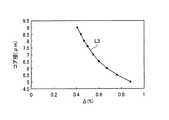 図8は、偏波保持光ファイバ10と同様の構造を有し、空孔径が25μmの偏波保持光ファイバにおいて、曲率半径10mmで曲げた場合の波長1550nmにおけるマクロベンディングロスが0.1dB/mとなる条件(以下、条件Bとする)におけるコア部の比屈折率差Δとコア径との関係を示す図である。なお、線L3が、条件Bにおける比屈折率差Δとコア径との関係とを示す線である。また、線L3は、下記式(4)の等号の場合で示され、線L3より右上側の領域は、式(4)の不等号の場合で示される。 FIG. 8 shows a macrobending loss at a wavelength of 1550 nm in a polarization maintaining optical fiber having a structure similar to that of the polarization maintaining