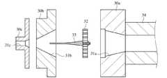 上記焼結粉に水、バインダー、可塑剤及び潤滑剤を混合した坏土を、例えば図8 に示す構造のダイ30から押出成形する。ダイ30は、スクリュー35を有する押出機34に連結した第一〜第三のブロック30a,30b,30cからなる。第一のブロック30aは拡径する円錐状内面31aを有し、外端面の凹部に、坏土の整流板32が嵌合している。整流板32の中心に貫通孔2を形成するための中心棒33が固定されている。第二のブロック30bはテーパ状の円錐状内面31bを有し、円錐状内面31bの内端は第一のブロック30aの円錐状内面31aの外端と同じ内径を有する。第三のブロック30cは第二のブロック30bの円錐状内面31bの外端と同じ内径を円錐状内面部有する四角形状の内面31cを有する。すなわち、内面31cの上流端部の内面は円錐状で、それ以外の内面は四角形状である。中心棒33の先端は第三のブロック30cの外端まで延在する。第一〜第三のブロック30a,30b,30cの内面31a,31b,31cは整流板32まで拡径した後縮径するキャビティを有する。整流板32の下流側で押出し方向に縮径したキャビティを有するために、ダイ30を通過する間に坏土中の板状結晶粒のc面は各辺に沿うように配向する。押出成形体は乾燥後所定の長さに切断する。押出の際に磁場を印加しても良い。(2) Extrusion Molding A clay obtained by mixing water, a binder, a plasticizer, and a lubricant into the sintered powder is extruded from, for example, a die 30 having a structure shown in FIG. The