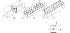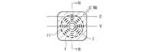 0.6 parts by weight to 100 parts by mass of the main component of Fe2 O3 , BaCO3 and Co3 O4 blended in a proportion of 60 mol% Fe2 O3 , 19.5 mol% BaO and 20.5 mol% CoO CuO was added and mixed with a wet ball mill using water as a medium. The obtained mixed powder was dried and calcined at 1100 ° C. in the air for 1.5 hours. The calcined powder was pulverized with a wet ball mill for 10 hours using water as a medium, and water, a binder, a lubricant and a plasticizer were added to prepare a clay having a water content of 13.8% by mass. Extruded clay using the die shown in Fig. 8, dried and then sintered in the atmosphere at 1150 ° C for 3 hours, with through-holes with a circular cross-section of 0.6 mm in diameter along the central axis, at each corner A 10 mm × 3 mm × 3 mm rectangular sintered body having a chamfered curved surface with a width of 0.5 mm was obtained (Sample 4). As a result of X-ray diffraction, it was found that the main phase of the sintered body was Y-type ferrite [main peak is (110)].