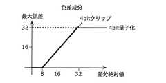 より詳細には、図7に示すように、差分符号化の場合、直前の画素(隣接画素)との輝度成分の差分絶対値が、圧縮後の符号量で表すことができる最大値以下に収まる場合は、圧縮前の差分絶対値と圧縮後の差分絶対値との最大誤差は0となる(図7の差分絶対値が8以下の実線部分)。また、隣接画素との輝度成分の差分絶対値が、圧縮後の最大値以下に収まらない場合は、圧縮後の差分絶対値が圧縮後の最大値にクリップされるため、最大誤差は画素同士の輝度値が離れるほど大きくなる(図7の差分絶対値が8〜16の実線部分と差分絶対値が16以上の破線部分)。例えば、差分符号化において、圧縮後の符号量の割り当てが4ビットの場合、圧縮後の符号量で表すことができる最大値は−8〜7となる。従って、差分符号化における最大誤差の推移は、図7の「4bitクリップ」のグラフ(図7の差分絶対値が16以下の実線部分と差分絶対値が16以上の破線部分)で示すように、差分絶対値が8ビット以下の領域では0になり、8ビット以上の領域では、差分絶対値に比例して大きくなる。 More specifically, as shown in FIG. 7, in the case of differential encoding, the absolute difference value of the luminance component from the previous pixel (adjacent pixel) falls below the maximum value that can be expressed by the code amount after compression. In this case, the maximum error between the difference absolute value before compression and the difference absolute value after compression is 0 (the solid line portion in FIG. 7 where the difference absolute value is 8 or less). In addition, when the difference absolute value of the luminance component with the adjacent pixel does not fall below the maximum value after compression, the absolute value after compression is clipped to the maximum value after compression, so the maximum error is between pixels. The larger the brightness value is, the larger the value becomes (the solid line portion with the difference absolute value of 8 to 16 in FIG. 7 and the broken line portion with the difference absolute value of 16 or more). For example, in the differential encoding, when the code amount allocation after compression is 4 bits, the maximum value that can be represented by the code amount after compression is -8 to 7. Therefore, the transition of the maximum error in the differential encoding is shown by the graph of “4 bit clip” in FIG. 7 (the solid line portion in FIG. 7 having a difference absolute value of 16 or less and the broken line portion having a difference absolute value of 16 or more). In an area where the difference absolute value is 8 bits or less, it becomes 0, and in an area where the difference is 8 bits or more, it becomes larger in proportion to the difference absolute value.