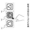 また本実施形態では、図9に示すような指示点Mの操作アイコンP1、P2、P3への引き込み処理を行う。これは、ディスプレイ2上で隣接する操作アイコンP1、P2、P3どうしが離間して表示されている場合でも、アイコン間の中間位置まで各操作アイコンP1、P2、P3に対応する指示点Mの判定有効領域を広げて設定している。これにより、図示するように指示点Mが振動によって各操作アイコンP2の表示領域から一時的にずれ出てしまった場合でも、当該操作アイコンP2の選択状態を維持できる。この引き込み処理は、例えばユーザの任意の時間だけアイコンの選択状態を維持し続ける必要のある操作に対して有効である。また、操作アイコンP1、P2、P3の選択状態を長く維持できることから、連成振動の学習状態も長く維持できる点で有効である。 In the present embodiment, the process of drawing the designated point M into the operation icons P1, P2, and P3 as shown in FIG. 9 is performed. This is because even when the adjacent operation icons P1, P2, and P3 are displayed on the