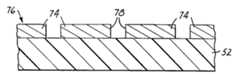 이 방법의 실행시에는, 시판되는 폴리이미드/구리 적층 복합체를 출발 물질로 사용하고, 추가량의 구리 전기 도금을 제거하여 제15 단계 및 제17 단계에서 일체 마스크를 형성하는 것이 바람직하다. 또한, 제9 단계 내지 제13 단계와 관련하여, 포토레지스트를 구리 호일에 적층시키고, 스텐실을 통해 광선에 노출시킨다. 삭감 기술의 경우에는 패턴 물질을 증착시키고자 할 때 포토레지스트를 제거/현상시키고, 제4도에 도시한 바와 같이 상기 영역에서 구리를 에칭 제거함으로서 기판(52)(하부층(56) 이하)상에 일체 마스크(70)를 제공한다. 나머지 포토레지스트를 제거한 후, 마스크 형상을 위해 부가 기술을 사용하는 경우와 동일한 방식으로 상기 물질을 처리한다.In the practice of this method, it is preferable to use commercially available polyimide / copper laminate composites as starting materials and to remove additional amounts of copper electroplating to form integral masks in