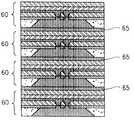 이어, 도5h 및 도6에 도시된 바와 같이, 절연성 양면 접착부재(65)를 매개물로 사용하여 도5g에 도시된 개개의 적층형 반도체 칩(60)들을 정렬한 후 열과 압력을 가해 복수층으로 적층한다. 즉, 동 도면은 도5g에 도시된 적층형 반도체 칩(60)을 정렬하여 4층으로 적층한 구조를 도시한 것으로, 상기 접착부재(65)의 재질은 폴리이미드막에 에폭시수지를 도포한 양면 접착부재를 사용하는 것이 바람직하다. 또한, 상기 전체 구조의 측면을 미세하게 연마하여, 상기 적층된 칩(60)들의 측면으로 새어나온 상기 접착 수지를 제거하고, 후속 공정인 제2도전물질(70)의 도포 공정을 용이하게 한다.Subsequently, as shown in FIGS. 5H and 6, the individual stacked