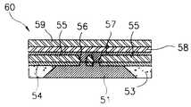 이어, 도5e에 도시된 바와 같이, 상기 전체 구조의 상면에 상기 제1절연물질층(53)과 동일한 물질로 된 제3절연물질층(58)을 도포하고, 그 제3절연물질층(58)의 상면에 상기 제2절연물질층(55)과동일한 물질로 된 제4절연물질층(59)을 형성한다.Subsequently, as shown in FIG. 5E, a third