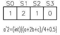 상기 필터가중값생성부(150) 및 일차원가중필터(160)의 동작을 보다 상세히 설명하기로 한다.  먼저 상기 픽셀 s1에 대해 적용되는 필터윈도우의 기본 가중값을 도 4a에 도시된 바와 같이 (1, 2, 1, 1)으로 설정하고, 상기 픽셀 s2에 대해 적용되는 필터윈도우의 기본 가중값을 도 4b에 도시된 바와 같이 (1, 1, 2, 1)으로 설정한다.The operation of the filter weight