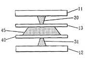 제3(a)도는 셀이 어셈블리될 때 스페이서(30,31)이 어떻게 겹치는지를 도시한다. 제3(b)도는 중간 기판(13)이 스페이서(30 및 31)의 고차점의 위치에서 효과적으로 클램프된 점에서의 셀의 단면을 상세히 도시한다.3 (a) shows how