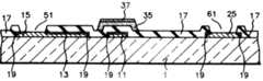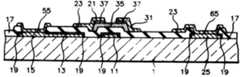 그리고, 크롬이나 크롬 합금과 같은 금속 등을 증착하고 패턴하여, 불순물 반도체 층(33) 위에는 소스 전극(21)과 드레인 전극(31)을 형성한다. 박막 트랜지스터가 형성되는 부분에서는 소스 전극(21)과 드레인 전극(31) 밑에 있는 불순물 반도체 층(27)이 연결되지 않도록 하기 위해서 소스(21)-드레인 전극(31)을 마스크로 하여 불순물 반도체 층을 식각하여 분리한다. 그리고 상기 소스 전극(21)들을 연결하는 소스 배선(23)을 형성한다. 그리고, 제1소스 콘택 홀(61)을 통해 소스 배선(23)과 소스 패드(25)를 연결시킨다. 이 때, 소스 패드(25)에는 알루미늄을 보호하기 위해 충분한 크기로 크롬 금속 층을 형성하여, 나중에 형성되는 소스 패드 연결 단자와 접속하기 위한 소스 패드 중간 전극(65)으로 사용하기도 한다. 마찬가지로 게이트 패드(15)에도 크롬 금속 층으로 알루미늄 층과 나중에 형성되는 게이트 패드 연결 단자와 제1게이트 콘택 홀(51)을 통해 접속되는 게이트 패드 중간 전극(55)을 형성한다(제2e도).A metal such as chromium or a chromium alloy is deposited and patterned to form a