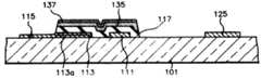 상기 저 저항 게이트 전극(111a), 저 저항 게이트 배선(113a), 저 저항 게이트 패드(115a) 그리고, 저 저항 소스 패드(125a)가 형성된 기판 위에 크롬, 몰리브덴, 탄탈 혹은 주석 등을 전면 증착한다. 포토 리소그래피 법으로 패턴하여 상기 저 저항 게이틀 전극(111a)을 덮는 게이트 전극(111)을 형성한다. 그리고, 상기 저 저항 게이트 배선(113a)을 덮는 게이트 배선(113)과, 상기 저 저항 게이트 패드(115a)를 덮는 게이트 패드(115)를 형성한다. 그리고, 상기 저 저항 소스 패드(125a)를 덮는 소스 패드(125)를 형성한다(제5b도).Chrome, molybdenum, tantalum, or tin is deposited on the substrate on which the low
