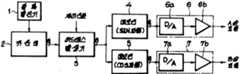 제1도에 있어서, 클록 발진기(1)의 출력은 카운터(2)에 전달되며, 카운터(2)는 이 클록에 의해서 카운트업 한다. 카운터(2)는 8 비트의 카운트 값(0∼255)을 어드레스 발생기(3)에 출력한다. 어드레스 발생기(3)는 ROM으로 구성되며, 000∼OFF 번지의 A 블록에는 제2(a)도, 100∼1FF 번지의 B 블록에는 제2(b)도, 200∼2FF 번지의 C 블록에는 제2(c)도에 각각 도시하는 특성선의 어드레스 데이타가 수납되어 있다. 아래에 설명하는 바와 같이, 이 각각의 특성선과 마찬가지의 시간축에 대한 회전각 변위(초점 렌즈의 변위)가 얻어지며, 이 어드레스 발생기(3)는 회전자의 회전방향 전환점에서는 시간축에 대한 회전각 궤적의 경사가 완만한 정현파가 되도록 어드레스를 발생한다. 상기 A, B, C 중 어떤 블럭의 어드레스 데이타가 출력될지는 제어 신호에 의해서 선택되며, 이 어드레스 발생기(3)의 어드레스 데이타는 2 개의 메모리(4, 5)에 각각 출력된다. 한쪽의 메모리(4)는 어드레스 데이타의 값이 차례로 카운트업되는 경우(제2(b)도에 도시하는 경우)에는 SIN 파형이 되는 전류값 데이타를, 다른쪽의 메모리(5)는 마찬가지로 카운트업 되는 경우에는 COS 파형으로 되는 전류값 데이타를 각각 갖는다. 이 각 메모리(4, 5)의 출력은 각각의 드라이브 회로(6, 7)에 전달된다. 각 드라이브 회로(6, 7)는 D/A 변환기(6a, 7a)와 증폭기(6b, 7b)를 가지며, 이 각 드라이브 회로(6, 7)의 출력이 A 상 코일 및 B 상 코일에 각각 공급된다.In FIG. 1, the output of the clock oscillator 1 is transmitted to the counter 2, and the counter 2 counts up by this clock. The counter 2 outputs an eight-bit count value (0 to 255) to the address generator 3. The address generator 3 is composed of a ROM. The address generator 3 is composed of a ROM, a second block (a) for an A block at