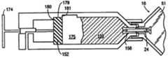 도 20은 주사기(150)의 형태를 갖는 잉크보충 시스템의 일 실시예의 단면도이다.  주사기(150)는 잉크주머니(51)내로 순환공기를 전혀 흡인함이 없이 프린트 카트리지(16)내의 잉크주머니(51)를 보충할 수 있도록 프린트 카트리지(16)상의 밸브(24)(도 3)에 접속되기에 적합한 것이 바람직하다.  바람직한 실시예에 있어서, 주사기(150)는 원통형상이며, 도 20의 단면은 주사기(150)의 주요 축을 따라서 양분한 도면이다.20 is a cross-sectional view of one embodiment of an ink replenishment system in the form of a