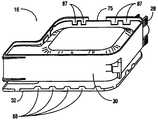 도 8은 하나의 강성 사이드 커버(32)와 그것을 프린트 카트리지의 외측 프레임(30)에 고정하는 방법을 보다 상세히 도시한다.  사이드 커버(32)내에 형성되어 있는 탭(88)과 정렬되어 슬롯(87)이 외측 프레임(30)내에 형성되는 것으로 도시하고 있다.  탭(88)이 슬롯(87)내로 삽입되면 사이드 커버(32)와 프레임(30)이 확고히 고착되게 된다.  탭(88)은 슬롯(87)의 측부를 형성하는 플라스틱 안으로 약간 절단되어 사이드 커버(32)가 프레임(30)에 고-마찰로 부착될 수 있게 하는 것이 바람직하다.  선택적으로는 사이드 커버(32)를 프레임(30)에 고착시키기 위하여 접착제가 사용될 수도 있다.8 shows in more detail a
