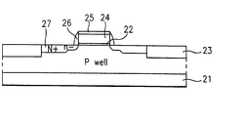 이어, 상기의 게이트 측벽(26)이 형성된 게이트 전극(24)을 마스크로 하여 As+이온을 5*1015/cm2,40KeV(±10%)의 조건으로 이온 주입하여 고농도 불순물 확산 영역을 형성한다. 그리고 850℃,30min(±10%)의 조건으로 열처리하여 LDD(Lightly Doped Drain) 구조의 소오스/드레인 영역(27)을 형성한다.Subsequently, a high concentration impurity diffusion region is formed by ion implantation of As+ ions under a condition of 5 * 1015 / cm2 , 40 KeV (± 10%) using the