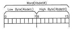 또한 세 개의 검출기들 (low byte detector), (high byte detector) 및 (word detector) (12), (14) 및 (16)은 상기 데이터 입력 버퍼들 (Dinbuf0)∼(Dinbuf15)에 저장된 데이터 비트들 중 프로그램될 비트들의 수를 제어하여 프로그램 시간(program time)을 최적화하기 위해 사용된다.  프로그램될 비트의 수가 4 개 또는 그 이하인 경우, 상기 검출기들 (12)∼(16)의 출력 신호들 (4bdetL), (4bdetH) 및 (4bdetW)은 모두 하이 레벨 (high level)로 설정되고, 그렇지 않을 경우 모두 로우 레벨 (low level)로 유지된다.Also, three detectors (low byte detector), (high byte detector) and (word detector) 12, 14 and 16 are data bits stored in the data input buffers Dinbuf0 to Dinbuf15. It is used to optimize the program time by controlling the number of bits to be programmed. If the number of bits to be programmed is four or less, the output signals 4bdetL, 4bdetH and 4bdetW of the