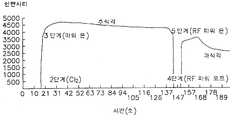 도5 및 도6의 분석결과로부터 SF6와 Cl2가스가 에천트로 작용하여 생성되는 주요 생성물은 SiFx(SiF+, SiF2+, SiF3+)가스이며, SiClxFy(SiCl+, SiClF2+, SiCl2F2+, SiCl2F+, SiClF3+)가스의 형태로도 식각됨을 알 수 있으며, RGA-QMS상의 가스의 거동은 도10의 EPD(End Point Detection) 스펙트럼의 결과와 잘 일치함을 알 수 있다. 도10에서 RF 파워온되는 3단계 이후 주식각이 이루어지며, RF 파워오프되는 4단계를 거쳐 안정화된 후 RF 파워온되는 5단계 후 과식각공정이 수행되는 것을 알 수 있다.From the analysis results of FIGS. 5 and 6, the main products generated by the action of SF6 and Cl2 as an etchant are SiFx (SiF+ , SiF2+ , SiF3+ ) gas, and SiClx Fy (SiCl+ , SiClF2+ , SiCl2 F2+ , SiCl2 F+ , SiClF3+ ) can be etched in the form of gas, the behavior of the gas on the RGA-QMS results of the EPD (End Point Detection) spectrum of FIG. It can be seen that it agrees well with. In FIG. 10, the stock angle is formed after three steps of RF power-on, and after the five steps of RF power-on, after the stabilization is performed through four steps of RF power-off, the over-etching process is performed.