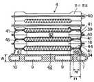 도1은 본 발명에 따른 제1실시예에서의 냉각장치의 측면도이다. 도2는 도1의 Ⅱ-Ⅱ 선을 따라 보여진 단면도이다. 도3은 도1의 Ⅲ-Ⅲ 선을 따라 보여진 단면도이다. 도4A 및 도4B는 방열관을 형성하기 위한 프레스 가공 판재의 측면도 및 평면도이다. 도5는 도1의 Ⅴ-Ⅴ 선을 따라 보여진 단면도이다.1 is a side view of a cooling apparatus in a first embodiment according to the present invention. FIG. 2 is a cross-sectional view taken along line II-II of FIG. 1. 3 is a cross-sectional view taken along line III-III of FIG. 4A and 4B are side and plan views of a press-formed sheet material for forming a heat dissipation tube. FIG. 5 is a cross-sectional view taken along the line VV of FIG. 1.