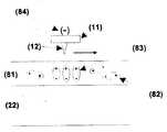 도8은 SiO2/Si 구조가 대신 Si 웨이퍼위에 강자성체 박막(81)(Ferroelectric Thin Film)을 정보를 저장하는 매개체로 쓴 구조를 보여주고 있다. 강자성체는 보통 유전체와는 달리 임의로 편향화(Polzrization)된 쌍극자(Dipole) 구조(82)를 가지고 있다. 이런 구조에다가 전기적인 필드를 걸어주면 임의의 편향된 쌍극자가 필드의 방향에 따라 편향 방향을 바꾸게 되고, 이 상태는 전기적 필드나 전압을 제거한 후에도 그대롤 유지되어 특정한 정보를 저장하고 있는 상태가 된다. 도 8에서는 그중 음전계(84)를 AFM 팁(11,12)으로 가했을 때, 강자성체 박막(81) 안에서 쌍극자들이 편향되는 모습을 보여준다(83). 이렇게 저장된 정보를 소거하는 방법은 도 6은 도 7과 동일하다. 읽는 경우도 마찬가지이다.FIG. 8 shows a structure in which a ferroelectric