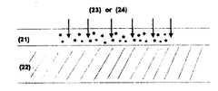 또한, 본 발명에서 사용하고자 하는 이온 주입법은 잘 알려진대로 어떤 특정한 이온들을 전기적으로 가속한 뒤 표적으로 하는 웨이퍼에 쏘아서 원하는 깊이, 농도로 도핑(DOPING)하는 것을 말한다. 따라서, 이온 주입법을 이용하여 SiO2/Si 적층구조에서 SiO2층(21)에 Si(23) 또는 Ge(24) 이온을 주입하여 아주 작은 크기의 나노 크리스탈(25)을 만드는 과정이 첨부한 도2에 도시되어 있다.In addition, the ion implantation method to be used in the present invention refers to doping to a desired depth and concentration by electrically accelerating certain ions and then shooting them on a target wafer. Therefore, a process of forming a very