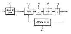 즉, 방송국과 같은 송신측에서는 신호를 송신하기 전에 원하는 전력 레벨로 변화시켜 주는 맵퍼(Mapper)를 통과시키게 되는데 지상방송용 8 VSB의 경우 맵퍼의 출력 레벨은 8 단계의 심볼 값(진폭 레벨) 즉, -168, -120, -72, -24, 24, 72, 120, 168 중 하나이다. 또한, 상기 맵퍼에서는 약속에 의해 832 심볼마다 4심볼의 수평 동기 신호를 강제로 만들어 삽입하고, 313 데이터 세그먼트 위치에서는 필드 동기 신호를 강제로 만들어 삽입한다. 이때, 상기 수평 동기 신호의 약속된 형태는 논리적으로 1, 0, 0, 1이고, 맵퍼 출력 레벨은 동기가 '1'일 때 '120', '0'일 때 '-120'으로 할당된다. 즉, 수평 동기 신호는 2개의 레벨만을 갖고 계속해서 매 데이터 세그먼트마다 반복된다.That is, the transmitting side, such as a broadcasting station, passes a mapper that changes to a desired power level before transmitting a signal. In the case of 8 VSB for terrestrial broadcasting, the output level of the mapper is 8 symbol values (amplitude level), that is,- 168, -120, -72, -24, 24, 72, 120, 168. In addition, the mapper forcibly creates and inserts 4 symbol horizontal sync signals for every 832 symbols by appointment, and field sync signals are forcibly created and inserted at 313 data segment positions. At this time, the promised form of the horizontal synchronization signal is logically 1, 0, 0, 1, and the mapper output level is assigned to '120' when the synchronization is '1' and '-120' when the '0'. That is, the horizontal synchronizing signal has only two levels and is repeated every data segment continuously.