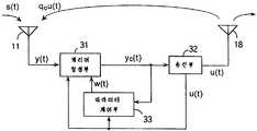 수신안테나(11)로 수신되는 수신신호 복소포락선 y(t)에는 희망파 복소포락선 s(t)와 송신안테나(18)로부터 송신된 송신신호 복소포락선 u(t)이 리크하여 수신된 간섭파 복소포락선 qou(t)와, 잡음 복소포락선 n(t)가 중첩되어, y(t)는 다음 수학식 1로 표시된다.In the received signal complex envelope y (t) received by the