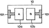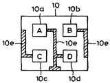 다시 도 9 및 도 10은 다소자 타이프의 초전소자를 사용한 경우의 사용예를 나타내고 있다. 도 9a, 도 9b는 4개의 적외선 수광부를 직병열로 접속하여 사용하는 경우의 초점소자 기판의 표면·이면의 도전패턴을 나타낸다. 도 10은 그 등가회로이고, 이 형태에서는 4개의 적외선 수광부 10a(A)∼10c(D) 가운데, 2개의 적외선 수광부 10a(A), 10c(C)와 10b(B), 10d(D)와는 어느것이나 병열로, 접속되고, 제1, 제2의 초전소자 1, 1'로서 사용되고, 용량소자 CA, CC를 병열로 접속한 것이 제1의 초전소자를 구성하고, 용량소자 CB, CD를 병열로 접속한 것이 제2의 초전소자 1'로서 구성되어 있다. 도 11은 다소자 타이프의 초전소자를 사용하여 구성된 전류전압 변환회로를 도 2에 대응시켜서 나타낸 것이다. 더욱이 도 9a, 도 9b에 있어서 좌·우의 패턴부분은 표면과 이면으로 도전부 10e를 통하여 단락하고 있다.9 and 10 show an example of use in the case where a super-element of some type is used. Figs. 9A and 9B show the conductive patterns on the front surface and the back surface of the focal element substrate when four infrared ray receiving portions are connected by a series-parallel array. 10 (A), 10c (C), 10b (B), and 10d (D) among the four infrared