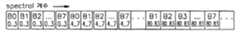 우선 양자화된 값들을 양자화된 값들의 sign 값을 따로 보관하고 절대값을취한다. 양자화된 주파수 데이터들을 비트 단위로 분할해서 최상위비트(MSB, Most Significant Bit)부터 최하위비트(LSB, Least Significant Bit)의 순으로 차례로 배열한다. 그리고 이렇게 비트 분할된 데이터들에서 4차원 백터(vector)들로 재구성한다. 만일 각각 4비트로 8개의 양자화된 값이 다음과 같이 2진수로 나타내어 진다고 가정하자.First, the quantized values are stored separately from the sign values of the quantized values, and the absolute values are taken. The quantized frequency data is divided into bits and arranged in order from the most significant bit (MSB) to the least significant bit (LSB). The data is reconstructed into four-dimensional vectors. Assume that eight quantized values of four bits each are represented in binary as