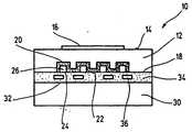 도 1은 공통으로 부호 10으로서 표시한 전기화학적 측정센서를 나타내며, 이전기화학적 측정센서는, 예를 들면 가스 혼합물중, 특히 내연기관의 배기가스중의 산소 함량의 측정에 사용할 수 있다. 측정센서(10)는 고체전해질(12)로 이루어지고, 도 1의 고체전해질의 상방향에 표시한 측부(14)상에는 제1 전극(16)이 배치되어 있다. 고체전해질(12)의 다른 측부(18)에는 제2 전극(20)이 배치되어 있다. 이 경우 전극(20)은 고체전해질(12)중에 매설되어 있고, 따라서 전극(20)의 외측부(22)는 고체전해질(12)의 측부(18)와 동일한 열로 배치되어 있고, 또한 전체에 한개의 평평한 표면이 생긴다.Figure 1 shows an electrochemical measuring sensor, commonly denoted by