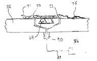 포움(64)을 경화시키는 양호한 기술은 도5에 도시된 전기적으로 가열된 코울 시트(72)를 사용하는 것이다.  코울 시트(72)는 홈(62) 위의 영역에서 코울 시트(72)의 상부면(76)에 체결되거나 코울 시트(72)가 제조될 때 그 안에 매립된 전기 가열 테이프(74)를 갖는다.  도5에 점선으로 부분적으로 도시된 단열 블랭킷(77)은 주변 공기에의 열 손실을 감소시키도록 코울 시트(72)의 상부 위에 놓여서 포움(64)이 경화되는 동안에 포움을 상승된 온도로 유지하는 데 필요한 전력을 낮출 수 있다.  가열 테이프에 인접한 온도 센서(78)는 도체(79)를 통해서 제어기(80)에 전달될 신호를 생성하며, 상기 제어기는 코울 시트(72)의 온도를 관찰하여 홈(62) 내의 포움(64)을 소정 경화 온도로 유지하도록 가열 테이프(74)에 전달될 전력원(82)으로부터의 전력을 조정한다.  전기적으로 가열된 코울 시트(72)는 포움 경화 사이클 중에 값비싼 오븐을 사용할 필요성을 없애주어 제조 공정에서의 비용을 줄일 수 있게 해준다.A preferred technique for curing the