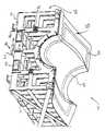 브리더 스트립(breather strip, 87)은 공구측 플라이(85)에 인접하게 위치하고, 진공 백(71)은 공구측 플라이(85) 및 벌집형 코어 요소(84) 등의 다른 부품들 위에 위치한다.  진공 백(71)의 둘레의 가장자리는 이 기술 분야에 공지되어 있는 밀봉 테이프(75) 등으로 홈(62)의 외측면 주위에서 공구면에 대하여 밀봉된다.  진공 백(71) 아래 및 밀봉 퍼티의 둘레 내측의 공간은 진공 라인(88)을 통해서 홈(62)에 인접한 공구의 진공 포트(90)에 연통하는 진공 펌프(86)에 의해 진공화 된다.  진공 포트 내의 체크 밸브(도시 생략)는 공구(30)가 오토클레이브(도시 생략)로 이송되는 동안에 진공을 유지한다.  오토클레이브에서, 진공 포트(90)는 진공원(86)에 재차 연결되고, 오토클레이브는 가압 및 가열되어 플라이 내에 예비 충전된 수지를 유동 및 경화시키고, 경화 수지로부터의 배출 가스는 진공 라인(88)을 통해서 배출된다.The breather strip 87 is located adjacent to the tool side ply 85 and the vacuum bag 71 is located above other components such as the tool side ply 85 and the