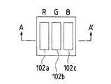 이하 적색, 녹색, 청색 발광원들(102a 내지 102c)의 구체적인 제조를 설명하겠다.  도 1은 도 3의 A-A' 선에 따른 단면 구조에 해당하며, 발광원들(102a, 102b, 102c)의 예로서 InP(인듐-인) 기판 상에 ZnCdMgSe 클래딩 층과 ZnCdMgSe 활성층을 포함하는 면발광형(surface emission type) 발광 다이오드(LED)의 구성을 도시하고 있다.Hereinafter, specific manufacturing of the red, green, and blue light emitting sources 102a to 102c will be described. FIG. 1 corresponds to a cross-sectional structure along the AA ′ line of FIG. 3, and includes a ZnCdMgSe cladding layer and a ZnCdMgSe active layer on an InP (indium-in) substrate as an example of light emitting