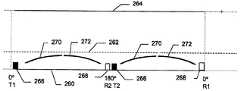 음향 경로는 송수신 어레이를 벗어난 산란중에 반사 경계와 조우할 수 있따. 반사 경계는 산란 중심의 겹침으로부터 간섭 산란을 사용할 수 있고, 만약 그렇다면 음향 경로의 세그먼트를 따르는 반사 어레이에 대한 유사 원리를 사용하여 설계될 수 있다. 그러나, 반사 경계에 대하여, 보다 강하게 산란하는 반사 엘리먼트를 사용하는 것이 바람직하다. 본 발명에 따라, 이들 반사 경계는 동일 평면에서 모드 변화를 가지거나 가지지 않고 파의 반사에 대응하거나, 예를들어, 표면의 평면에서 이동하는 파로부터 표면에 기울어진 각으로 지향된 벌크파로의 모드 전환에 대응하는 중요한 푸리에 성분을 사용한다.The acoustic path may encounter reflective boundaries during scattering outside the transmit and receive array. The reflection boundary can use interference scattering from the overlap of the scattering centers, and if so can be designed using similar principles for the reflection array along the segments of the acoustic path. However, it is preferable to use reflective elements that scatter more strongly with respect to the reflective boundary. According to the invention, these reflection boundaries correspond to the reflection of the wave with or without a mode change in the same plane, for example, the mode of the bulk wave directed at an angle tilted to the surface from a wave moving in the plane of the surface. Use important Fourier components corresponding to the conversion.