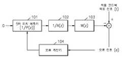 지각가중필터(103)는 다음 수학식 3과 같은 형태를 가지며, LPC 음성 합성기(102)의 출력인 합성된 음성과 목표 신호를 비교할 때, 사람의 청각기관의 특징을 이용하도록 하는 기능을 수행한다.  The