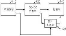 또한, DC-DC 변환부(220)는, 상기 주제어부(210)로부터 입력받은 밝기 조정 신호에 따라 후술하는 발광부(250)에 조정 전류를 공급하고, 상기 주제어부(210)로부터 발광 인에이블 신호를 입력받으면 DC-DC 변환을 수행함으로써 후술하는 모드 제어부(240)에 발광용 전류를 공급하는 역할을 한다.In addition, the DC-