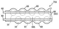 다음에, 도 27에 도시한 바와 같이, 상기와 같이 베이스 시트(60)와 다수의 반도체 디바이스(10)를 조립한 조립체(67)를 소정의 성형 금형 내에 수용하고, 용융 상태가 투명한 합성 수지(예를 들면, 아크릴이나 폴리카보네이트 등)를 주입하 여 성형하면, 베이스 시트(60)와 다수의 반도체 디바이스(10)가 합성 수지로 이루어지는 광 투과 부재(68) 내에 내장된 상태로 되어, 거의 투명한 시트 또는 필름형의 반도체 모듈(70)이 얻어진다.  그리고, 외부 도선의 접속을 위해, 베이스 시트(60) 양단부의 외부 도선 접속부(65)의 일부는 광 투과 부재(68)로부터 돌출된 상태로 성형한다.Next, as shown in FIG. 27, the