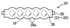 25개의 입자형의 반도체 디바이스(10)는 도전 방향을 일치시킨 상태에서 5행 5열로 배치되고, 도전 접속 기구(27)에 의해 각 열의 복수의 반도체 디바이스(10)가 전기적으로 직렬 접속되는 동시에, 각 행의 복수의 반도체 디바이스(10)가 전기적으로 병렬 접속되어 있다.  도전 접속 기구(27)는 6개의 금속제 접속 리드(21∼26)로 구성되어 있다.   6개의 접속 리드(21∼26)는 최하행의 반도체 디바이스(21)의 하면 측 양극(6a)에 접속된 접속 리드(21)와, 각 행의 반도체 디바이스(10)와 그 상면측에 인접하는 행의 반도체 디바이스(10) 사이에 장착된 접속 리드(22∼25)와, 최상행의 반도체 디바이스(10) 상면측 음극(6b)에 접속된 접속 리드(26)로 이루어진다.  접속 리드(22∼25)의 각각은 그 하측 반도체 디바이스(10)의 음극(6b)과 그 상측 반도체 디바이스(10)의 양극(6a)을 접속하고 있다.  이렇게 해서, 각 열의 반도체 디바이스(10)는 접속 리드(22∼25)에 의해 직렬 접속되고, 각 행의 반도체 디바이스(10)는 접속 리드(21∼26)에 의해 병렬 접속되어 있다.The 25 particle-shaped