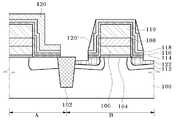 우선, 도1a에 도시된 바와 같이 실리콘 기판(100)에 소정의 소자 분리 공정으로 트렌치 소자 분리막(STI : 102)을 형성하여 셀 영역(A)과 페리 영역(B)을 분리한다. 그리고, 상기 실리콘 기판에 웰 임플란트 공정을 진행하여 도시되지는 않지만 N 웰 및 P 웰을 형성한다.First, as shown in FIG. 1A, the trench