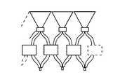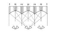 유사 광학망을 이용한 배열 구조는 이러한 단점을 극복하기 위한 것으로, 도 5a 및 5b 에 도시된 바와 같이 두 종류의 유사 광학망을 사용할 수 있다. 도 5c 는 유전체 플레이트, 와이어 격자와 같은 반투명 스크린을 이용하여 방향성 결합기(directional coupler)와 유사한 특성을 얻을 수 있음을 나타내고 있다. 그러나, 이러한 유사 광학망을 이용한 배열 구조는 대규모 배열 안테나의 아주 좁은 빔 스캐닝에만 제한적으로 적용할 수 있다는 문제점이 있다.The arrangement structure using the similar optical net is to overcome this disadvantage, and two types of similar optical nets may be used as shown in FIGS. 5A and 5B. 5C shows that a semi-transparent screen such as a dielectric plate, a wire grating can be used to obtain properties similar to a directional coupler. However, there is a problem that such an arrangement using a similar optical network can be limitedly limited to very narrow beam scanning of a large array antenna.
