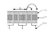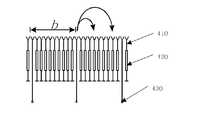 도 4a 내지 4c 는 종래의 주름진 도파관 배열 구조도이다. 주름진 도파관 배열 구조는, 도 4a 및 4b 에 도시된 바와 같이, 외부에서 입력되는 신호를 수신하는 배열 소자(410, 411), 리액티브 임피던스(reactive impedance)를 갖고 상기 배열 소자(410, 411)에 반사 터미네이션(reflective termination)의 기능을 하는 리액티브 부하(420, 421)를 포함한다. 여기서, 단지 몇 개의 배열 소자만 위상 제어 소자에 직접 연결되고, 나머지 대부분의 방사 소자는 리액티브 부하에 연결된다. 이러한 리액티브 부하가 부착된 수동 방사 소자에서의 방사는 위상 제어 소자에 직접 연결된 능동 방사 소자와의 상호결합 및 리액티브 부하의 반사에 의해 이루어지며, 도 4a 및 4b 에 하나의 반복단위(b)에서 이루어지는 반사 과정이 도시되어 있다. 한편, 도 4c 에는 리액티브 부하를 위해 다양한 도파관 길이를 갖는 주름진 배열 구조가 도시되어 있다. FTEP 형성을 위해서는 필요에 따라 더욱 충분한 결합이 요구되는데, 이를 위해 개구면 위에 추가 수동 산란체를 설치할 수 있다. 그러나 이러한 반사적 부하 배열 구조, 즉 주름진 도파관 구조를 이용한 배열 구조는, 안테나 소자 배열 간격이 0.7 내지 0.85λ 이므로 위상 천이기가 다수개 필요하고, 3% 이상의 배열 안테나 설계가 불가능하며, 부피가 큰 것과 동시에 무게도 무거우며, 시스템 가격이 높은 문제점이 있다.4A-4C are conventional corrugated waveguide arrangements. The corrugated waveguide array structure has