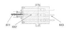 상기 중심 소자(610) 내에 장착된 입력 원형 동축케이블(611)은 입력 신호를 급전하는 역할을 하며, 또한 상기 중심 소자(610) 내에 장착된 편파기(612)는 원형 도파관(즉, 입력 원형 동축케이블(611)) 내에 위치한 얇은 유전체 판으로 요구하는 편파를 형성하며, 유전체봉(613)은 진행파를 형성하여 방사하는 역할을 하며, 전자파 상호결합을 통해 FTEP를 이루는 단위 방사 패턴을 만드는 역할을 한다.The input circular