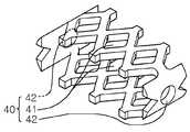 이와 같은 방식으로 척추융합 하는 종래의 척추융합 시술용 이식구(40)는 도 1에 나타낸 바와 같이 상호 대향하는 양쪽이 관통되고 둘레를 따라가면서 일정하게 구멍(41)이 형성되어 있는 연속형 띠 형태로 이루어져 있으며, 선단과 후단에는 각각 척추융합 이식구(40)을 삽입하거나 90°회전시키기 위해 시술 드라이버를 연결하거나 뼈 재료나 융합 촉진 재료를 투입하기 위한 홀(42)이 형성되어 있다. 특히, 상기 척추융합 이식구(40)의 선단부는 후단부 보다 좌우 폭이 넓게 되어 있어서, 이식 완료 후 인접하는 추체 사이의 앞뒤 간격에 알맞게 삽입되어 자리를 잡을 수 있게 된다.The conventional spinal fusion procedure implant 40 for spinal fusion in this manner is a continuous band form in which