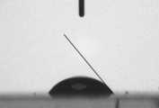 상술한 바와 같이 본 발명에 의해 제안된 금속중간층을 갖는 광촉매 코팅재 의 각종 실시 예에 있어서, 기판을 폴리머로 하는 경우, H2O의 친수 특성을 통해 확인한 접촉각은 중간층 도입 재료별로 최대 50% 감소 효과를 얻어, 중간층 도입 경우에 있어서의 광산화 분해 반응력이 증가함을 확인할 수 있으며 이는 도 5a 및 도 5b에 도시된 바와 같다. 도 5a는 본 발명에 의해 형성되는 광촉매물질의 접촉각을 도시하였고, 도 5b는 종래의 광촉매물질의 접촉각을 도시하였으며, 그 결과치는 하기의 표 1에 기재된 바와 같다.As described above, in various embodiments of the photocatalyst coating material having the metal intermediate layer proposed by the present invention, when the substrate is a polymer, the contact angle confirmed through the hydrophilic property of H2 O is reduced by up to 50% for each intermediate layer introduced material. It can be confirmed that the photooxidative decomposition reaction force in the case of introducing the intermediate layer is increased, as shown in Figs. 5a and 5b. Figure 5a shows the contact angle of the photocatalyst material formed by the present invention, Figure 5b shows the contact angle of the conventional photocatalyst material, the results are as shown in Table 1 below.