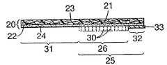 기계적 패스너 패치(26)의 일반적인 구조가 도 3에 도시되어 있다. 이것은 실질적으로 접착제 층(24)에 의해 백킹(21)에 부착될 수 있는 제1 면(29)과 표면에 기계적 패스너 부재(30)가 제공되는 제2 면(28)을 지닌 베이스 시트(27)로 이루어진다. 베이스 시트(27) 및 기계적 패스너 부재(30)는 서로 동일하거나 상이한 재료로 구성될 수 있다.The general structure of the