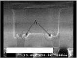 이러한 문제점들을 극복하기 위하여 선(先)비아방식을 사용하고 있다, 하지만, 도 10a 내지 도 10c에서 도시된 측벽 펜스(sidewall fence; 'A'참조)와 같이, 트렌치를 형성하기 위한 건식식각후 비아홀에 채워져 있는 유기(organic) BARC(Bottom AntiReflection Coating) 으로 인해 스페이서(spacer)가 형성된 것처럼 표족하게 남게 된다. 여기서, 도 10a는 트렌치를 완전식각하는 경우 발생되는 측벽 펜스를 도시한 SEM 사진이다. 도 10b는 트렌치를 부분식각하는 경우 발생되는 측벽 펜스를 도시한 SEM 사진이다. 도 10c는 도 10a 또는 도 10b에서 트렌치가 형성된 후 트렌치 형성용 식각 마스크인 포토레지스트 패턴(photoresist pattern)을 제거한 후 발생되는 측벽 펜스를 도시한 SEM 사진이다.In order to overcome these problems, a pre-via method is used. However, as in the sidewall fence (see 'A') shown in FIGS. 10A to 10C, a via hole after dry etching to form a trench is shown. The organic BARC (Bottom AntiReflection Coating) filled on the surface leaves the spacer as if formed. Here, FIG. 10A is a SEM photograph showing the sidewall fence generated when the trench is completely etched. FIG. 10B is a SEM photograph illustrating a sidewall fence generated when the trench is partially etched. FIG. FIG. 10C is a SEM photograph illustrating sidewall fences generated after removing the photoresist pattern, which is an etching mask for forming trenches, after the trench is formed in FIG. 10A or 10B.