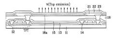 이로써, 종래 기술에 따른 탑-이미션 방식의 액티브 매트릭스 유기 EL 소자를 완성한다.This completes the active matrix organic EL device of the top emission method according to the prior art.