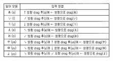 도 5는 본 발명의 제 1실시 예에 따라 한글/알파벳 모음을 입력하기 위한 펜 드래그 방향과 한글 변환문자 및 확장문자를 입력하기 위한 펜 드래그 방향을 도시하고 도면,FIG. 5 illustrates a pen drag direction for inputting a Hangul / alphabet vowel and a pen drag direction for inputting Hangul conversion characters and extended characters according to the first embodiment of the present invention;