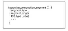 도 7을 참조하면, 방법 2에 의하면 온 디맨드 및 일반 인터랙티브 그래픽 스트림은 모두 동일한 구조체(interactive_composition_segment)를 사용하며, ICS_type(702)으로 양자를 구별한다. 즉, ICS_type이 0이면 일반 인터랙티브 그래픽 스트림을 나타내고, ICS_type이 1이면 온 디맨드 인터랙티브 그래픽 스트림을 나타내도록 정의한다.Referring to FIG. 7, according to Method 2, both on demand and general interactive graphic streams use the same structure (interactive_composition_segment), and the two are distinguished by ICS_type 702. That is, if ICS_type is 0, it represents a general interactive graphic stream, and if ICS_type is 1, it is defined to represent an on demand interactive graphic stream.