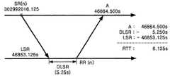 상기 지연시간(DLSR)이 경과한 후에 수신휴대단말기(40)로부터 전송되는 수신자보고(RR: RECEIVER REPORT) 정보가 송신휴대단말기(10)에 의하여 수신되는 시간(A)은, 일 예로, 46864.500 s 인 경우, 계산으로 확인되는 왕복지연시간(RTT) 값은 6.125 s 이며, 상기 도2의 오른쪽에 계산식이 기록되어 있다.A time A during which the receiver report (RR: RECEIVER REPORT) information transmitted from the receiving